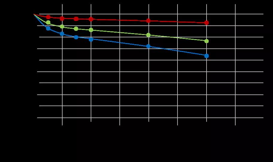 下圖顯示不同放電率下電壓與電池容量的關系。放電率愈高,電池容量愈低。溫度低時,電池容量也會降低。