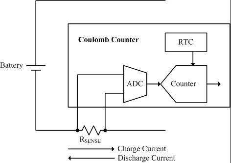 庫侖計量法的操作原理是在電池的充電/放電路徑上的連接一個檢測電阻。ADC量測在檢測電阻上的電壓,轉換成電池正在充電或放電的電流值。實時計數器(RTC)則提供把該電流值對時間作積分,從而得知流過多少庫倫。