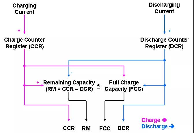 庫侖計量法可精確計算出充電或放電過程中實時的荷電狀態。藉由充電庫侖計數器和放電庫侖計數器,它可計算剩余電容量 (RM)及完全充電容量(FCC)。同時也可用剩余電容量(RM) 及完全充電容量 (FCC) 來計算出荷電狀態,即 (SOC = RM / FCC)。此外,它還可預估剩余時間,如電力耗竭(TTE)和電力充滿(TTF)。