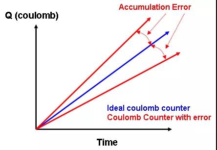 主要有兩個因素造成庫倫計量法準確度偏差。第一是電流感測及ADC量測中偏移誤差的累積。雖然以目前的技術此量測的誤差還算小,但若沒有消除它的好方法,則此誤差會隨時間增加而增加。下圖顯示了在實際應用中,如果時間持續中的未有任何的修正,則累積的誤差是無上限的。