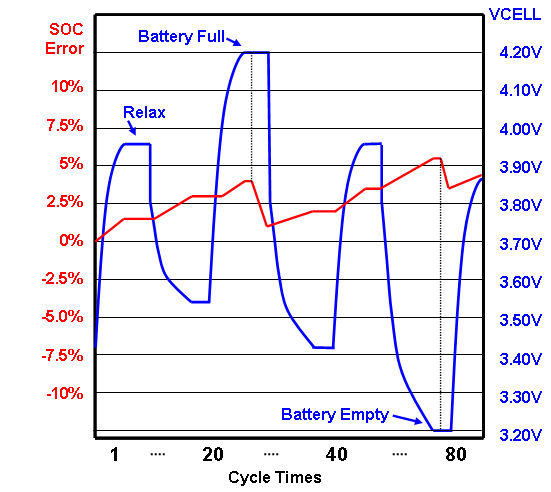 它的計算方式是根據電池電壓和開路電壓之間的動態差異,借著使用迭代算法來計算每次增加或減少的荷電狀態,以估計荷電狀態。相較于庫侖計量法電量計的解決方案,動態電壓算法電量計不會隨時間和電流累積誤差。庫侖計量法電量計通常會因為電流感測誤差及電池自放電而造成荷電狀態估計不準。即使電流感測誤差非常小,庫侖計數器卻會持續累積誤差,而所累積的誤差只有在完全充電或完全放電才能消除。