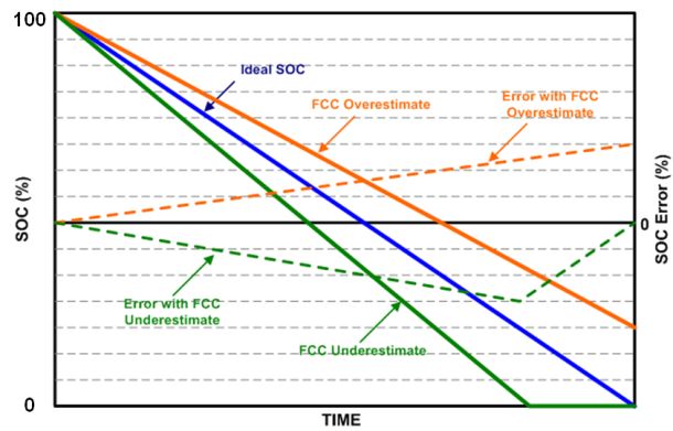 造成庫倫計量法準確度偏差的第二主要因素是完全充電容量(FCC)誤差,它是由電池設計容量的值和電池真正的完全充電容量的差異。完全充電容量(FCC) 會受到溫度,老化,負載等因素影響。所以,完全充電容量的再學習和補償方法對庫侖計量法是非常關鍵重要的。下圖顯示了當完全充電容量被高估和被低估時,荷電狀態誤差的趨勢現象。