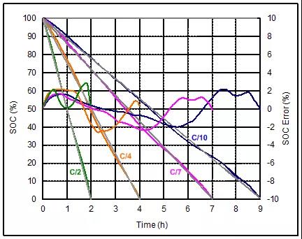 下面是動態電壓算法在不同放電速率條件下,荷電狀態的表現。由圖可知,它的荷電狀態精確度良好。不論是在C/2,C/4,C/7和C/10等的放電條件下,此法整體的荷電狀態誤差都小于3%。