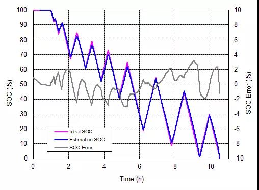 下圖顯示在電池短充短放情況下,荷電狀態的表現。荷電狀態誤差仍然很小,且最大誤差僅有3%。